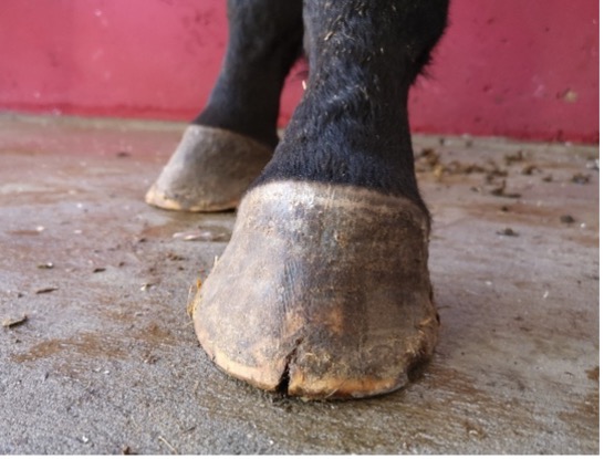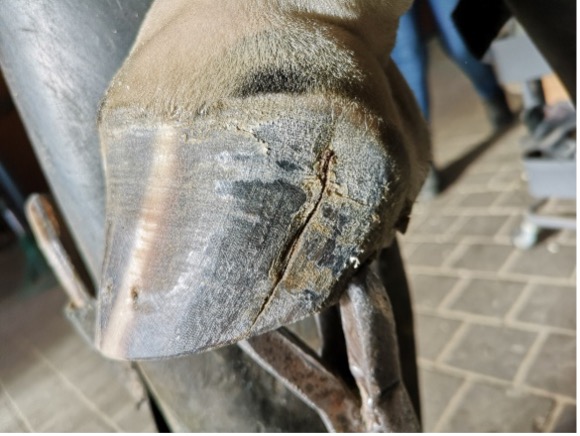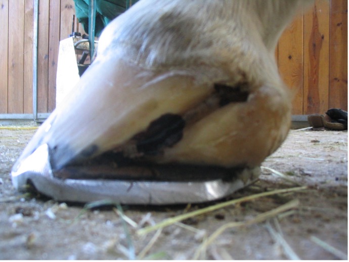 Attention ! Ce qu’on appelle communément une seime horizontale n’est pas véritablement une seime, mais plutôt un décollement de la paroi, dû à un abcès ou à un impact sur la couronne. Ce décollement descend avec la pousse de la corne et disparaît lorsqu’il arrive en bas du pied. À ce moment, le maréchal pourra le parer.