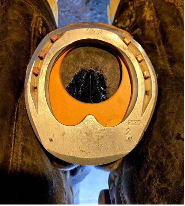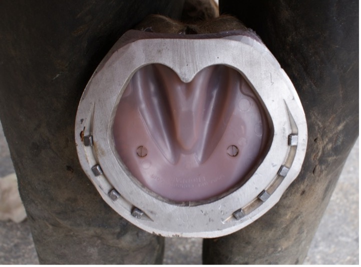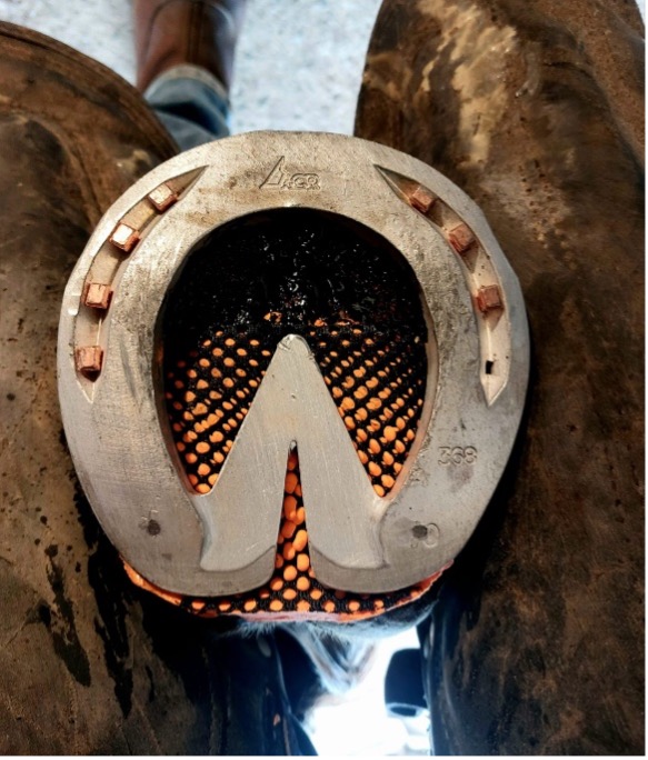 Pour accompagner ces dispositifs, il est toujours préférable de soutenir la sole et la fourchette via un fer à planche ou un fer en cœur avec plaque et silicone de soutien, afin de limiter l’élasticité de la boîte cornée.