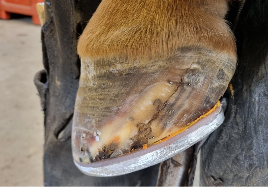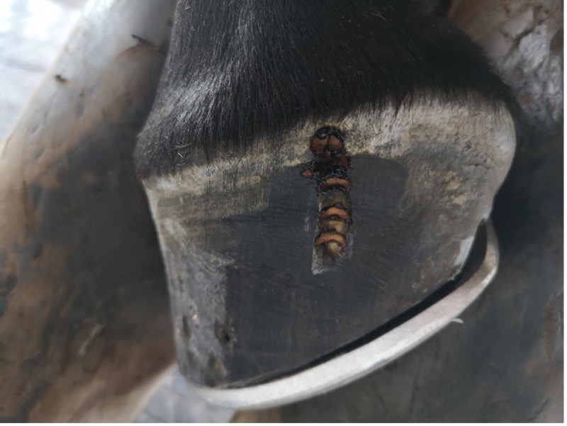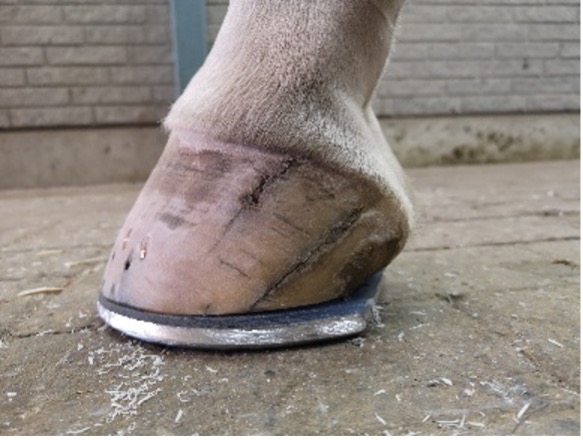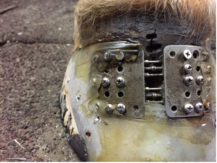 L’utilisation de résine polyuréthane méthacrylate (Glu-U shoe Fix ou Shoe Feet) peut servir à combler et stabiliser la seime. C’est une option intéressante selon les cas et les préférences du maréchal-ferrant. Parfois, il peut être indispensable d’avoir recours à un mode de fixation des deux bords de la seime, par exemple avec des agrafes, des plaques de fixation (Michael Pool) ou d’autres systèmes de renfort (lame en serpentin en acier appliquée à chaud dans la paroi). Le recours à ces différentes techniques demande une bonne connaissance de la maréchalerie et de l’anatomie du pied.